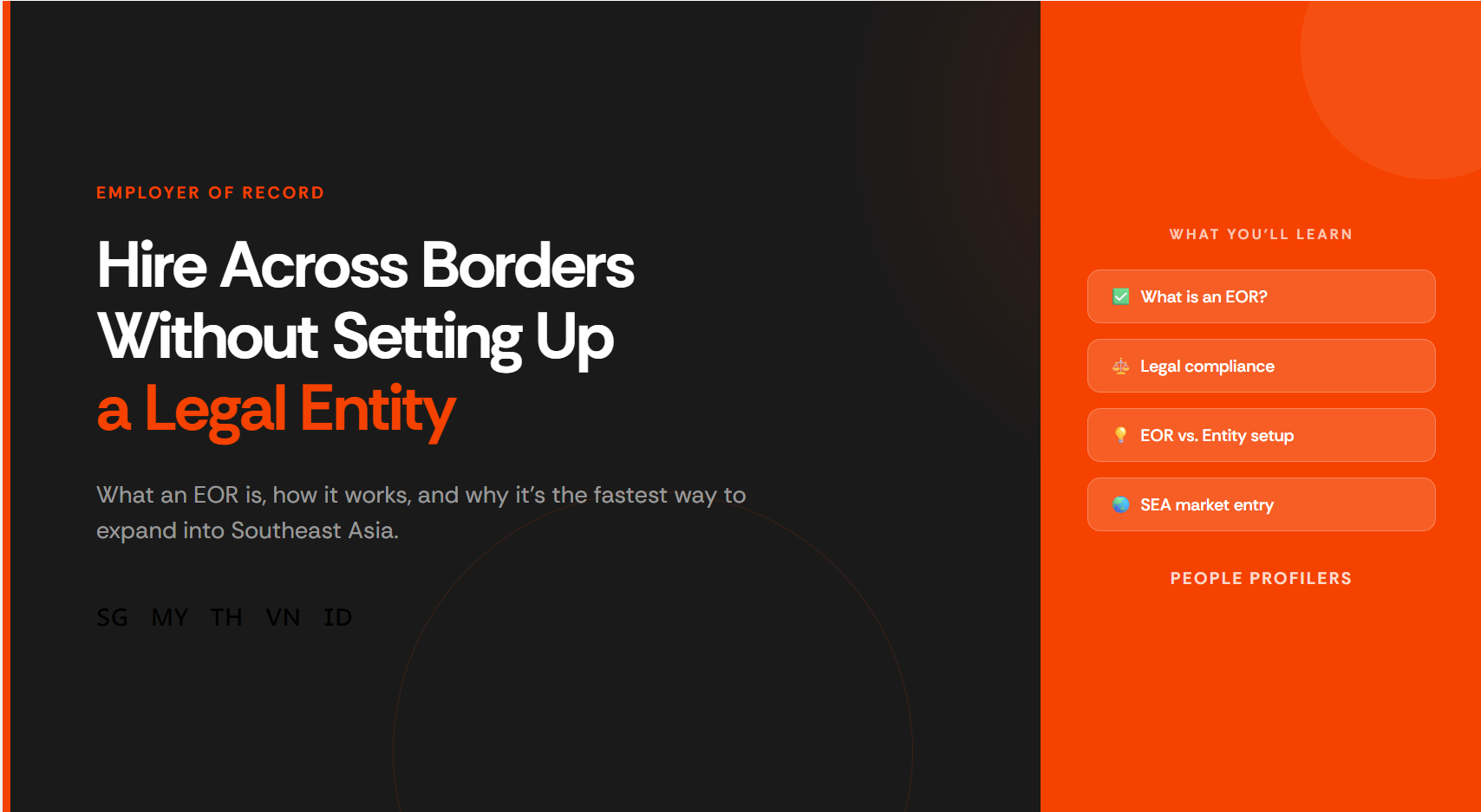 As your EOR provider, we will handle all your HR related matters such as tax, payroll, HR advisory, sourcing and hiring in compliance with Singapore’s labour regulations, work pass applications and even onboarding/offboarding while you grow your business and serve your customers.